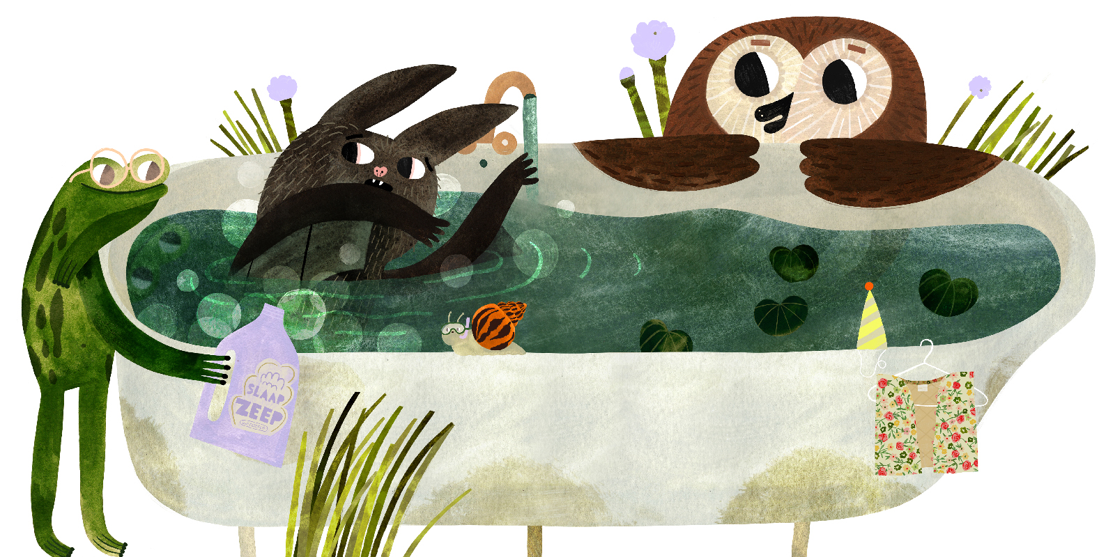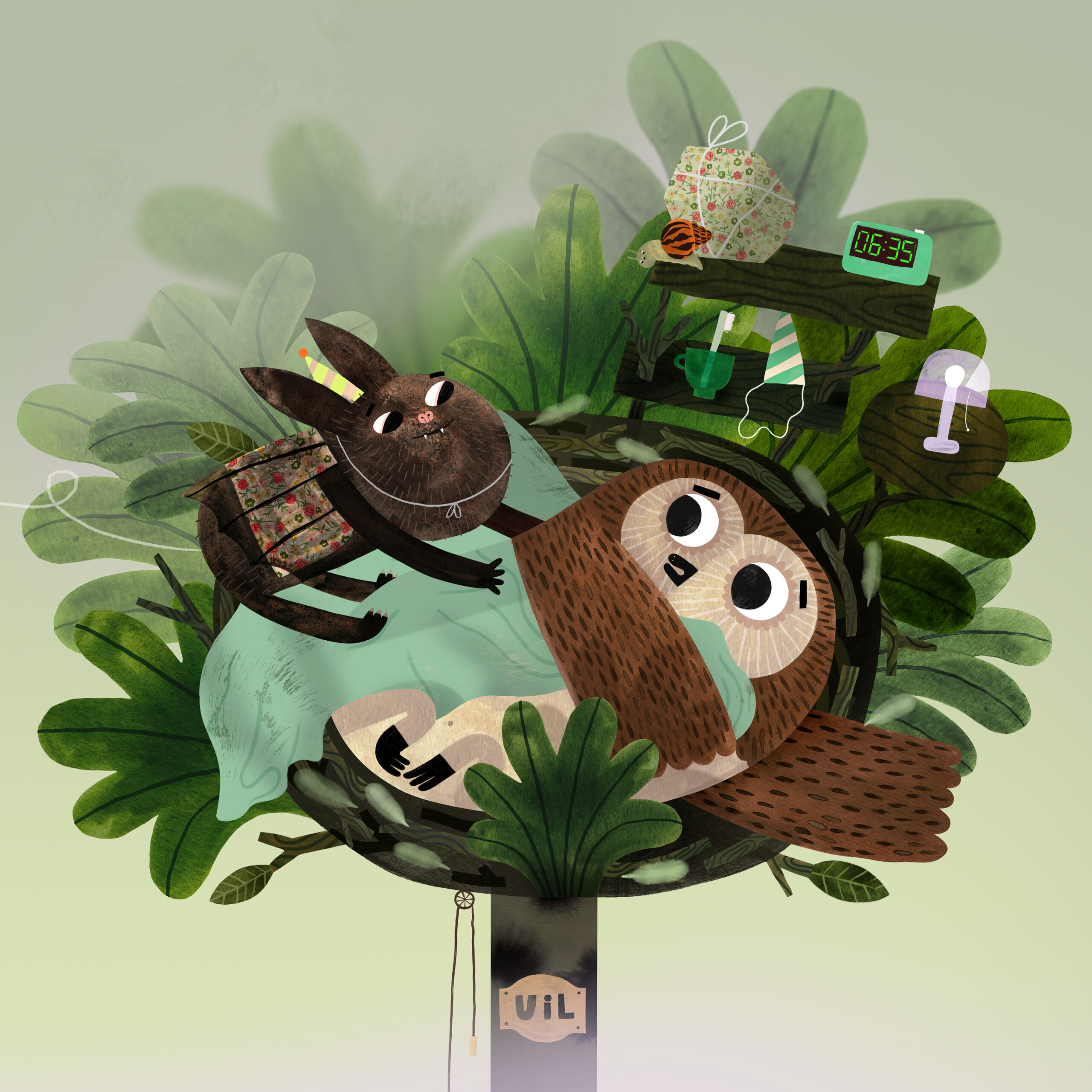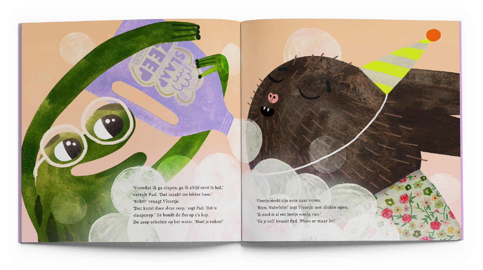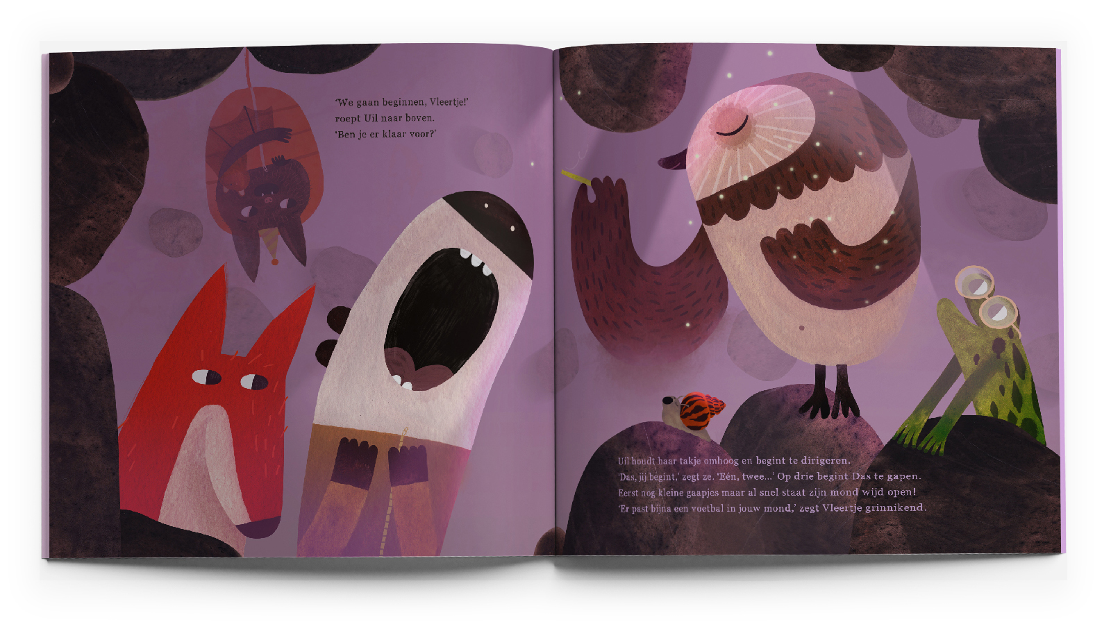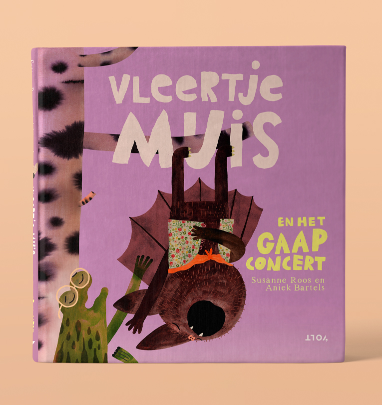 Together with writer Susanne Roos and publisher Volt, I created this original read-aloud book. Vleertje Muis en het Gaapconcert explores bedtime rituals, the thrill of anticipation, mosquito cake, presents, and all the soft comforts that make drifting off feel safe: cosy beds, sleepy-time soap, and warm moss milk, everything a little bat might need.